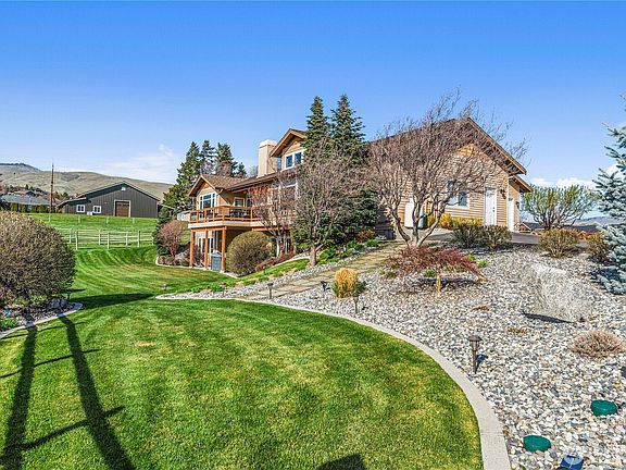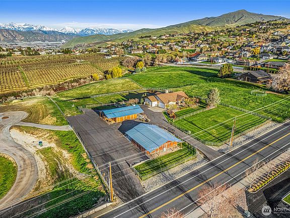 Beautiful Sunnyslope Custom home on 5 acres with sweeping views of the Wenatchee valley, Orchards and Cascade Mountain range. Comfortable 4 bedroom Daylight Rambler that has so much to offer. Open floor plan with river rock fireplace and bright sunny spacious kitchen with views to the Mountains. Primary suite with patio door to the deck. Library/office off the entry and additional main floor bedroom. Downstairs offers two more bedrooms, a second living area, and a large bonus exercise room. Attached Garage has a finished hobby room in 3rd stall. Two Deluxe Outbuildings- features a 5 car shop with HVAC and a second barn/shop with 4 horse stalls and a tack room. A rare blend of privacy, space, and stunning views—just minutes from town!