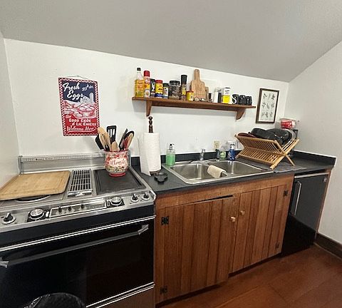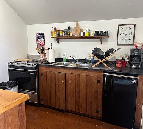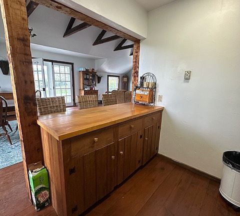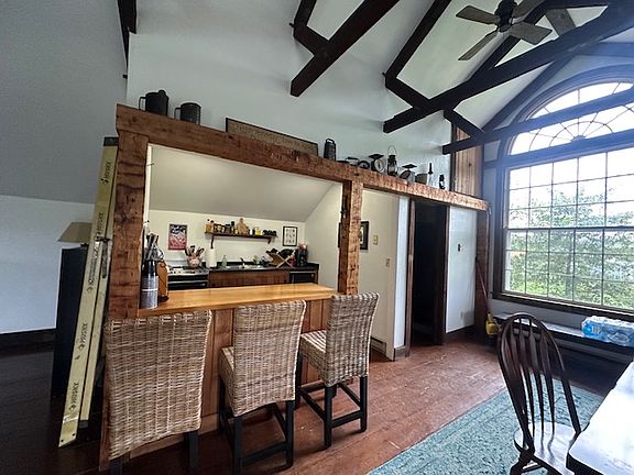 Open floor plan - spacious and inviting! This studio apartment is being rented partially furnished. We could remove one or both sofas. High vaulted ceilings with exposed beams. The kitchen includes a range and mini-fridge. There is a bar area with 3 bar stools for seating as well as a solid wood dining room table. There are wooden beams showcasing the bar area and a solid wood bathroom door that flows with the rustic style of this studio apartment. The bathroom has a walk-in shower, vanity and toilet. There are solid hardwood floors throughout the living space. The Palladian windows and French doors allow streams of sunlight to enter this space. There are nice solid wood pieces of furniture such as a credenza and hutch for tenant use. The fireplace is the focal point of the room and has a solid wood mantle and stone hearth. The fireplace is for decorative purposes only. The view is breathtaking with the green fields and pastures.