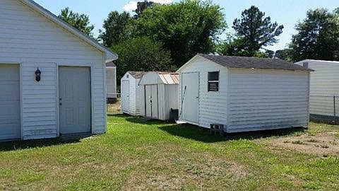 Great corner lot house for rent with ample storage buildings. House is ADA/wheelchair accessible with a fenced in backyard that contains a large garage and three additional outbuildings. Incredible storage potential! The house has hardwood floors, fresh paint, updated appliances, washer/dryer, dishwasher, and lots of windows for natural light! The property has great mature trees on the corner for shade. All the rooms have been recently renovated. The bedrooms are spacious and could be easily converted into office areas if desired. Right in the middle of a quiet and safe neighborhood just outside of Kinston, this is a great bargain on a well-maintained family or commuter home.