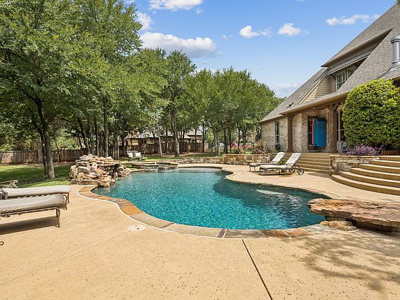 Welcome to your dream home in the heart of Southlake with Open enrollment for the esteemed Carroll Independent School District. This stunning 5-bedroom, 5-bathroom residence offers a plethora of luxury features and a prime location overlooking Cliffs Park at Clariden Ranch. Spanning 5,013 square feet, this home boasts a formal dining room with an adjacent Butler’s pantry and wine bar, a private study with custom built-ins, and an inviting open-concept kitchen and family room adorned with a stone fireplace and expansive windows that showcase resort-style backyard views. The chef’s kitchen is a culinary delight, featuring a spacious island with seating, a farm sink, stainless steel appliances, gas cooktop, double ovens, a pot filler, and a built-in refrigerator with walk-in and Butler’s pantry. The first floor hosts a large media room perfect for movie nights, while the second floor includes three additional bedrooms and 3 baths, a living room with a wet bar and a versatile bonus room—ideal as an exercise room, dance studio, or additional bedroom. Retreat to the spacious primary ensuite with separate vanities, jetted tub and shower. Second bed down is split providing comfort and privacy for all family members and guests. Enjoy your own resort-style backyard featuring a second kitchen, stone fireplace, pool with spa and waterfall, fire pit, and multiple serene seating areas nestled in a park-like setting. This dynamic property rests just minutes away from upscale shopping, dining, entertainment, and cultural amenities of Southlake Town Square and quick access to DFW Airport offering both privacy and accessibility. With its exquisite craftsmanship and luxurious amenities, this property is more than a home—it's a lifestyle. Experience the best of Southlake living in this magnificent residence.