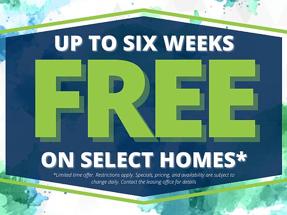 - Special offer! Up to Six Weeks Free on Select Homes! *Limited time offer. Restrictions apply. Specials, pricing, and availability are subject to change daily. Contact the leasing office for details