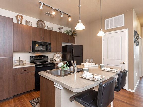 We offer a sparkling pool with sun decks, a state of the art fitness center, a residents lounge, Wifi access and a coffee bar. Our pet friendly community also features a Bark Park for our four legged residents! Your spacious apartment home will feature stainless steel appliances, 9 foot ceilings, full size washers and dryers, and several different layouts to choose from including both carpet and faux wood flooring!