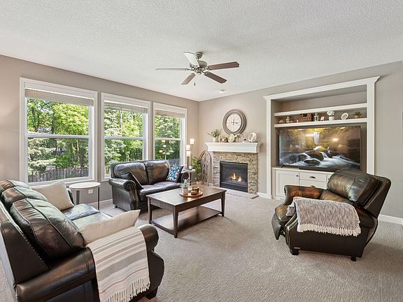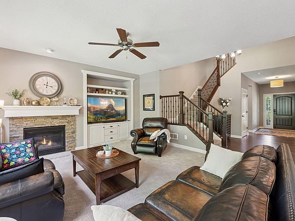 The open Great Room is where everyone will want to be, with cozy built-ins, a stone-surround gas fireplace, and easy flow into a formal dining space for holidays or game nights.