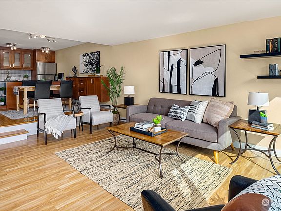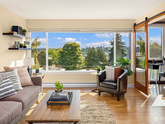 Welcome to the Eldorado II, perched above the street w/views of the canal, Ballard Bridge & Cascade mountains. This bright, open floor plan includes large windows from the spacious dining/living area welcoming in the natural light & panoramic territorial views. Kitchen features cherry cabinets, granite countertops, farm sink & SS appliances. Spacious primary BR w/2 closets & ensuite full bathroom. The living space includes an enclosed porch & can be closed w/sliding barn door, perfect for office or guest sleeping area (murphy bed included). Convenient laundry & storage located across the hall. Designated tandem parking w/1 covered. Self-run HOA w/low dues, secured entry & wonderful amenities include a cabana w/game room, outdoor pool & gym.