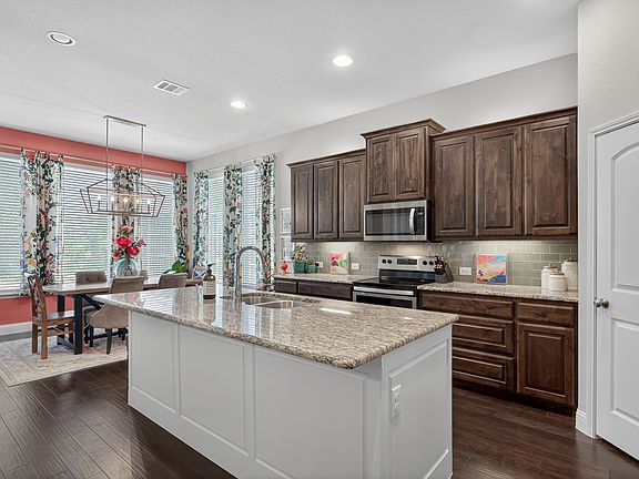 Welcome to this beautifully maintained home in a peaceful Denton neighborhood near UNT’s Discovery Park! Built in 2018 by Wyndham Homes, the open floor plan creates a natural flow between the living room, kitchen, and dining area. Rich engineered wood flooring enhances the main living areas, anchored by a cozy fireplace in the spacious living room. The kitchen is both stylish and functional, featuring granite countertops, spacious island, electric range, walk-in pantry, and an ample amount of cabinetry. The private primary suite offers a spa-like retreat with a dual-sink vanity, garden tub, separate shower, and a large walk-in closet. The secondary bedrooms are split for privacy. Step outside to enjoy the covered patio and serene backyard, surrounded by trees and thoughtfully designed landscaping—ideal for relaxing or gathering with friends. Just minutes from I-35 and US-380, this home offers quick access to shopping, dining, parks, walking trails, and schools. This is a truly special property feels both sophisticated and welcoming, perfect for relaxing, entertaining, and simply enjoying home!