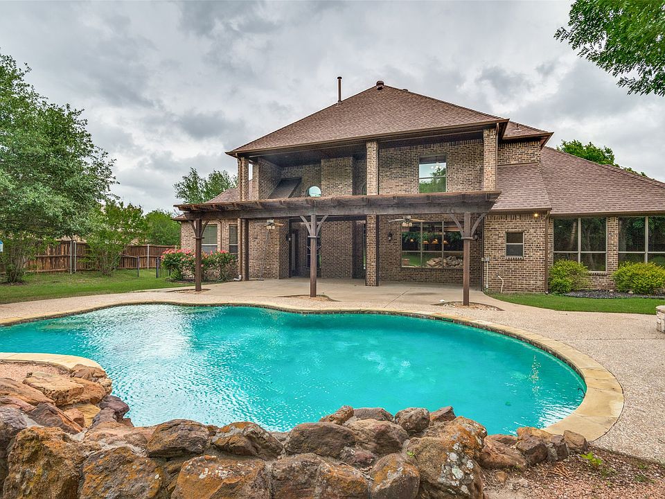 CHECK OUT THIS PRICE IMPROVEMENT...BEST PRICED HOME IN THIS SOUGHT AFTER NEIGHBORHOOD, this luxurious Troy Priddy custom-designed residence is a rare gem—lovingly maintained by its original owner and thoughtfully crafted to offer comfort, elegance, and versatility. From the moment you step inside, you're greeted by the timeless charm of a living room with a warm fireplace and built-ins—ideal for cozy evenings or stylish entertaining. The formal dining room is perfect for memorable dinner parties, and a dedicated study with built-ins and wood floors offers a serene space for remote work or reading. The heart of the home is a stunning gourmet island kitchen, adorned with sleek granite countertops, stainless steel appliances, double ovens, MCW and ample glass front display cabinets. A planning desk anchors the mud room right off the oversized 3 car garage. The spacious game room with rich hardwood floors & another fireplace boasts glass pocket doors. Whether you're hosting game night or relaxing with family, this area offers the perfect backdrop. Downstairs, a luxurious master suite with ample WIC & gun closet offers a private retreat with an ensuite bath that invites you to unwind. Another bedroom, also with an ensuite bath, is perfect for guests. Upstairs, you’ll find 3 generously-sized bedrooms, 2 full baths, & another inviting living area—ideal for multi-generational living or just giving everyone their own space. Step outside and you’ll find your personal oasis: a sparkling pool with a waterfall, a separate hot tub, and a covered patio perfect for summer gatherings. A convenient half bath ensures pool guests stay comfortable without stepping through the entire house, and a firepit will be a welcome addition for smores. With fresh paint and recent carpet, updated security system, a recently replaced roof, and thoughtful touches throughout, this is more than a house—it’s a lifestyle. Don’t miss your chance to call it home.