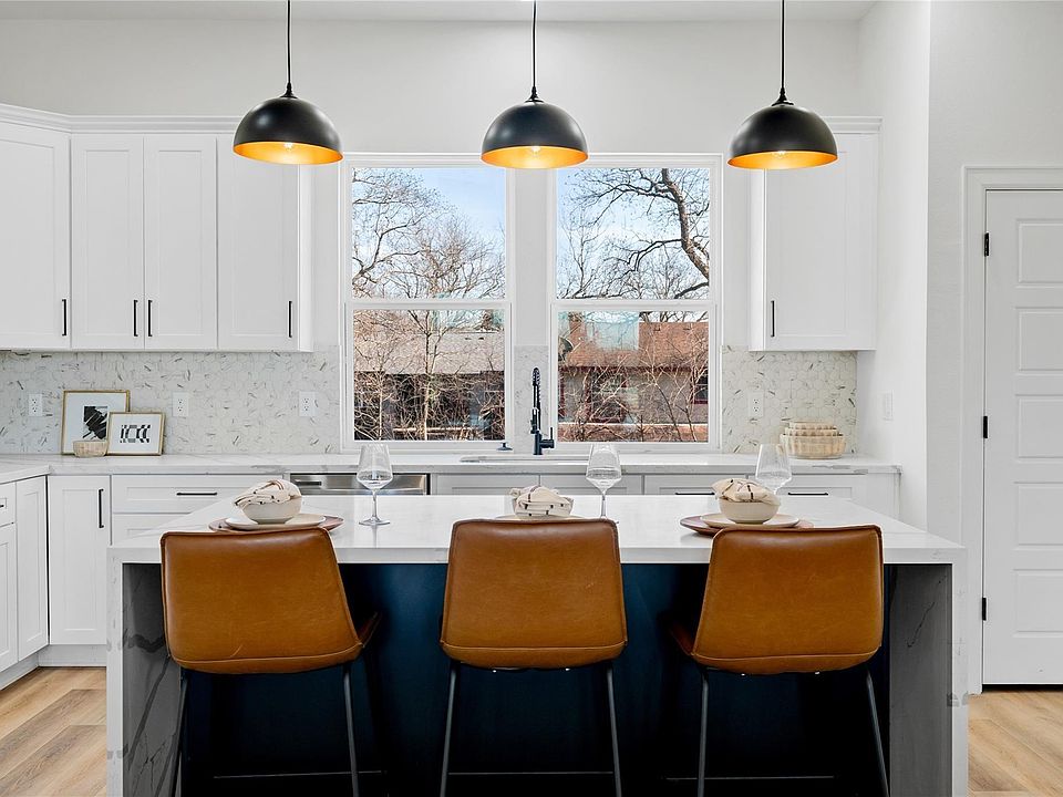 Private yardSpacious living-dining areaRoomy utility spaceStriking hexagon tile backsplashOversized islandExtended countersWrap-around counters