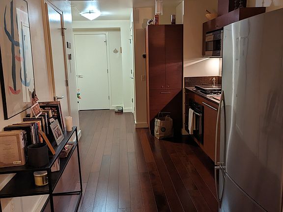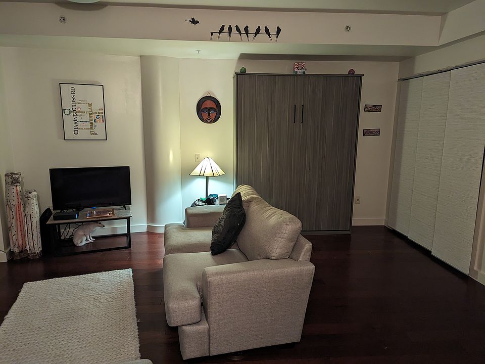 Luxury condo in high-rise building by South Waterfront. Feels like a one bedroom when custom made wall bed is left upright. Great river views. Concierge. Underground gated parking. One year lease. Renter only pays for electric and internet.