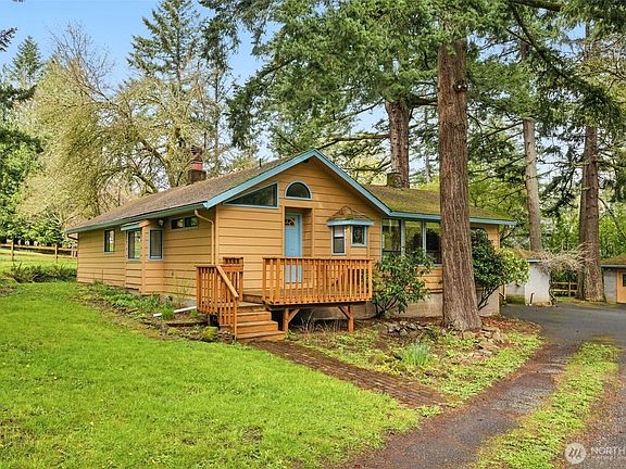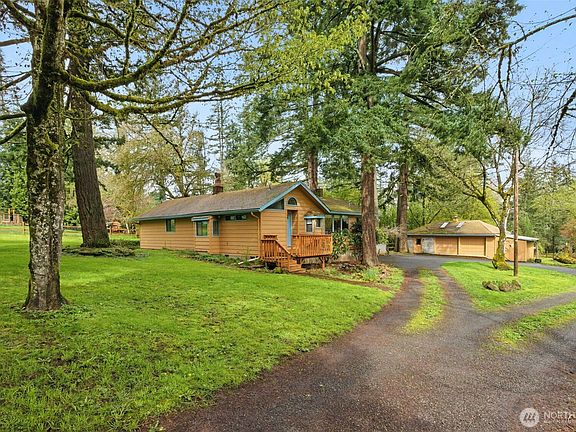 Tucked away on nearly 4 acres of peaceful, wooded land, this 3-bed, 2-bath home offers charm, privacy, and space to breathe. Inside, enjoy vaulted ceilings, hardwood floors, and custom woodwork. The kitchen features a functional layout, walk-in pantry, and large windows for natural light. The primary suite includes a fireplace, built-ins, and serene views. Step outside to a spacious deck, fruit trees, garden beds, chicken coop, and open lawn. A large detached garage with shop space adds room for hobbies or storage. Per Clark County, two ADUs may be allowed (buyer to verify). Just minutes from downtown Washougal and 20 minutes to PDX, this peaceful retreat is close to everything. Come see what makes this property so special!