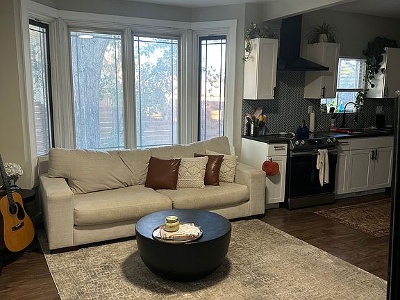 The spacious interior features hardwood floors, high ceilings, cozy living spaces, and updated amenities throughout. New washer, dryer, dishwasher, refrigerator. The bathrooms are clean, updated, and stylish.