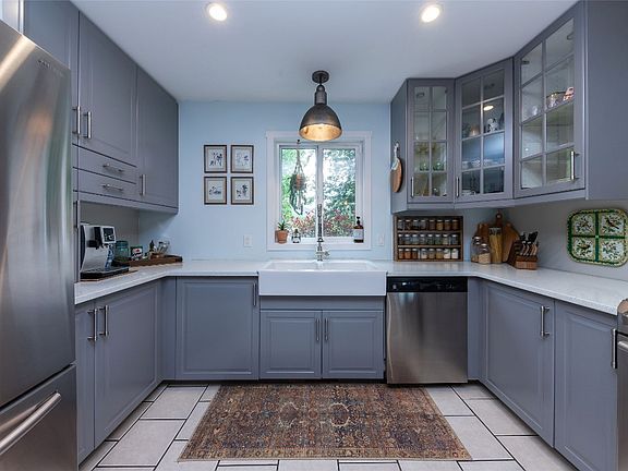 Warm country-style kitchenSs appliancesFarmhouse sinkWood-burning stoveUpdated wdSun deckPrivate retreat