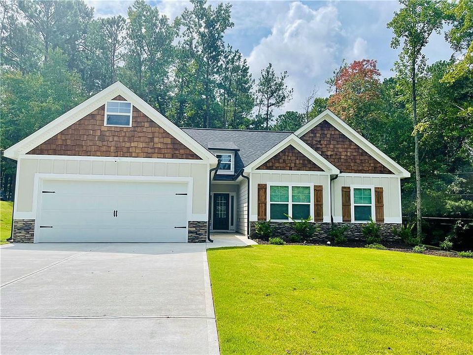 Home for the holidays in the charming Harmony Grove Plan! Upon entering you will be greeted with an open and spacious great room/dining room combo featuring premium flooring, vaulted ceilings and a stacked stone fireplace. Preparing meals has never been easier in the designer kitchen with plenty of cabinets, stylish granite counters and a view to the breakfast area. The primary suite boasts an airy feeling with trey ceilings, en suite with dual vanities, soaking tub, tiled shower with glass door and a large walk in closet. Enjoy relaxing or entertaining on the covered back patio with a spacious yard. Close proximity to Atlanta and Smyrna/Mabelton. This home is perfectly priced to sell and includes a $10,000 concession to help with buying down your interest rate or towards closing costs, call today for information. Stock photos used, exterior details and finishes will vary. Home will be completed by Jan 15th.