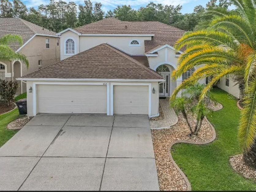 MOTIVATED SELLER, OFFERING $10,000 BUYER'S INCENTIVE! Located in the sought-after Plantation Palms Golf Club Community with NO CDD and NO Flood Insurance Required, this fabulous 2-story, 2316 SF home on a serene conservation lot features 4 bedrooms, 3 bathrooms, and 3-car garage. FRESHLY PAINTED, and with NEW ROOF and NEW AC, the open floor plan on the first floor seamlessly flows from the formal living room into the kitchen and then on to the family room providing great entertainment space for family and friends. A good size bedroom and full bathroom on the first floor would allow for elderly parent(s) or guests to live in comfort without having to climb stairs. It could also be used as an office if working from home. Laundry room by the garage comes with washer and dryer. Upstairs, the spacious Master Bedroom with walk-in closet and ensuite bathroom has an attached room that could serve as a separate sitting room, office, or nursery. 2 additional bedrooms upstairs are good size and share another full bathroom. Wait till you step outside to the pool and external sitting deck area with no neighbors in the back and experience the tranquility of nature providing a resort-like environment! Plantation Palms features an 18-hole Championship Golf Course, a Lighted Driving Range, an 18-hole Mini Golf Course, fully stocked Pro-Shop, a beautiful Event Venue and a family-friendly restaurant, Mulligan’s Pub which features daily specials and Happy Hour seven days a week! A Public Library, Land o'Lakes Recreation Complex, Publix Shopping Center, Premium Outlet and Wiregrass Malls are all within a few minutes of driving distance. Call for your viewing appointment today.