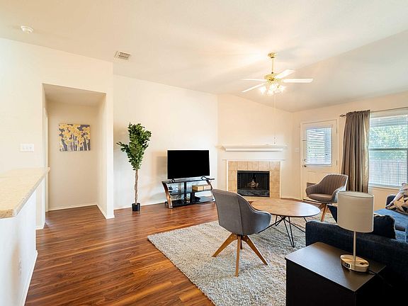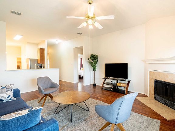 Location! Location! Location! This 4 Bedroom home in North Denton backs to a greenbelt with play park and walking trails. Enjoy your summers on the extended covered patio, or entertain inside with the open concept kitchen to living room, wood floors, wood burning fireplace, abundant shelving, and multiple walk in closets. The front room makes a perfect office, dining room, or second living area. The community is quiet, safe, and highly desired - with easy access to parks, lakes, and trails. Make this beauty on Beatriz your home away from home today.