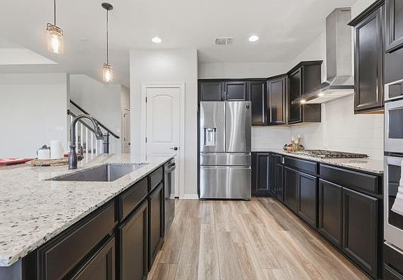 Lovely home, approximately 2254 sq feet, four bedrooms, three full baths, laminate flooring, carpet and ceramic tile. Home features two tray ceilings with crown molding, recessed lighting, open concept floor plan (Laredo), with center island, granite countertops, pendant lighting above island, separate dining area, covered back porch with gas hookup connection, larger backyard. Stainless steel kitchen appliances convey. All blinds on windows convey. Master bedroom has a bay window area with four windows; master bath has double vanity, granite counter tops, separate shower and garden tub, walk in closet. Upstairs loft has a fourth bedroom and full bathroom next to it. Paint has been touched up throughout various parts of the house.