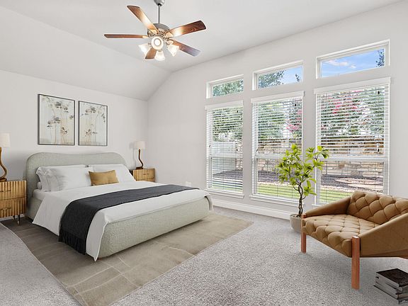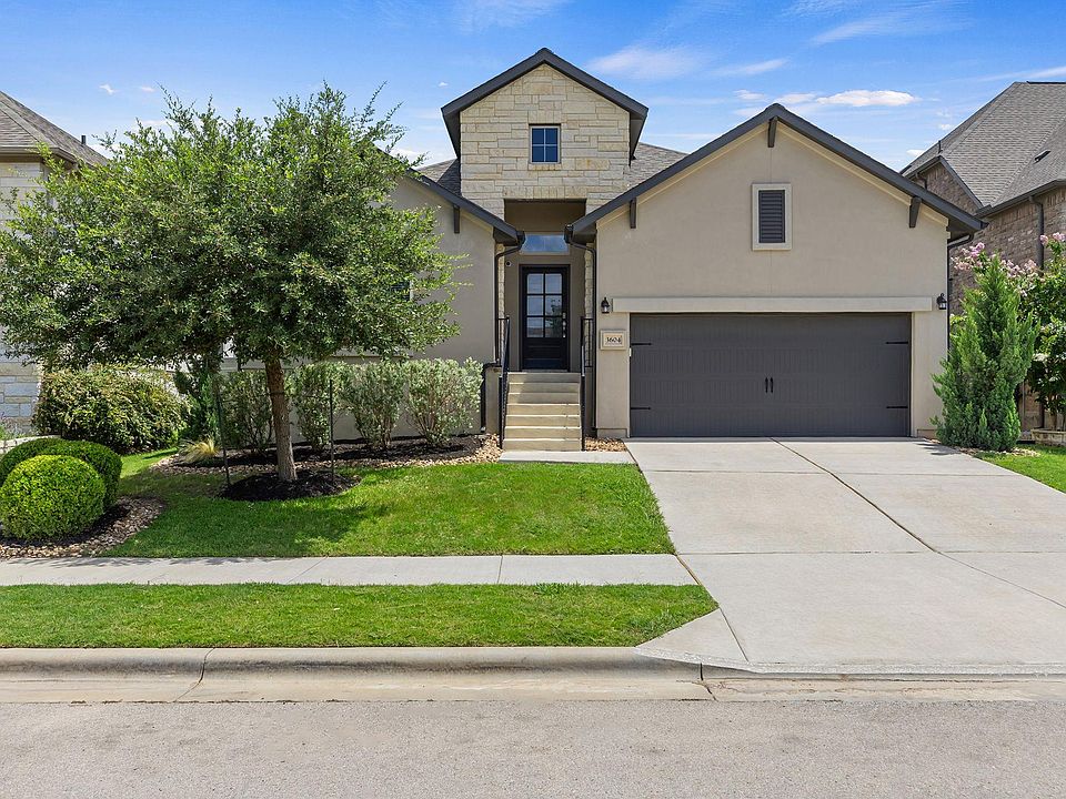 **$10K BONUS TO BUYERS** BRING AN OFFER** Located just inside the neighborhood of Wolf Ranch West! So close to shopping, dining, major highways for an easy commute, and major employers. This Perry Home was built in 2019 with just over 2100/sq ft, a 3 bedroom, 2 bath, 2 car garage, on a nice private lot with rock wall fence in the back yard. Modern design and light interior color palette, wood-look tile flooring throughout all main living areas, center island in the open kitchen, designated dining area, study or media room, and oversized covered patio.
