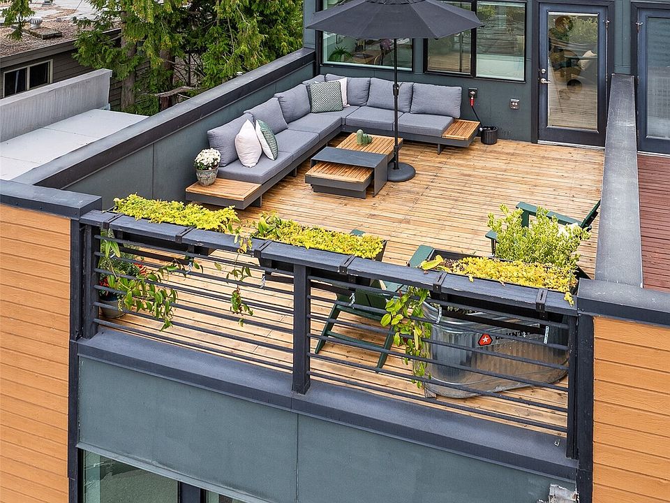 Spacious 2 bed + 2 office townhome in the heart of Fremont at stylish Fremont Lofts 3604. Multiple levels of soaring windows flood the open living and dining areas with natural light year-round. Flexible layout comfortably accommodates 2 dedicated home offices for remote work or creative pursuits. Airy main bedroom retreat with sunset views. Generous storage including gear garage, loft, and walk-in closet keeps bikes, outdoor gear, and belongings neatly organized. Recent upgrades such as AC mini-splits, automatic blinds, and induction stove provide modern, eco-friendly comfort. The rooftop deck offers privacy, greenery, and sweeping hill views. Moments from public transit, 99, and Burke-Gilman Trail along the Fremont Canal. No HOA!