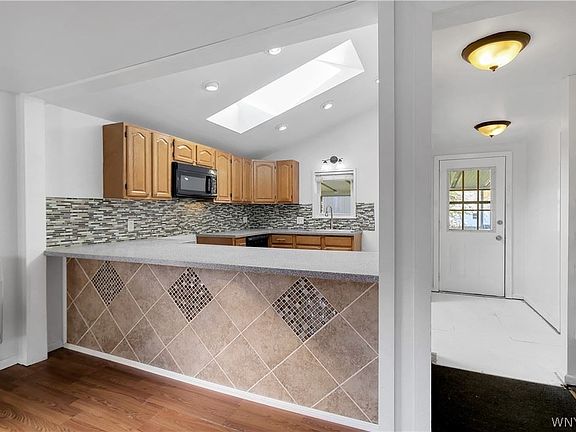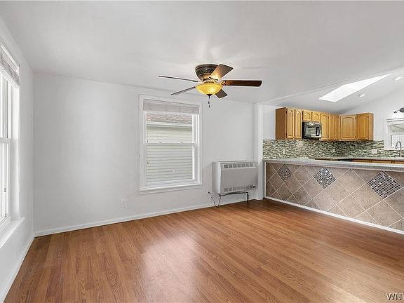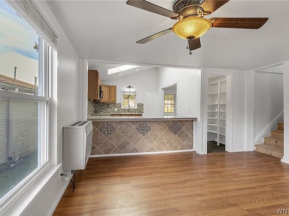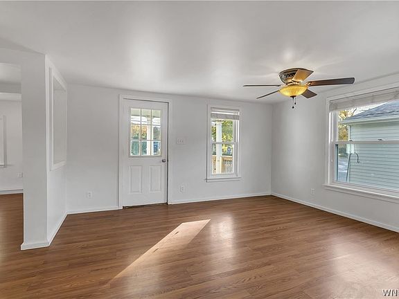 Well-maintained 2 bedroom house in Ransomville. Updated, bright kitchen open to dining room and large living room. First floor laundry. 2 bedrooms upstairs. 12 x 20 covered deck in back overlooks good-sized private yard. Shed less than 10 years old. All plumbing and electrical updated within last 10 years. Lower section of roof replaced 2022. Wall furnace heat and two newer A/C - heat split units. Wilson School District. Ready to move in and make yourself at home - or would make a good rental property. Available now - offers will be considered as they come in.