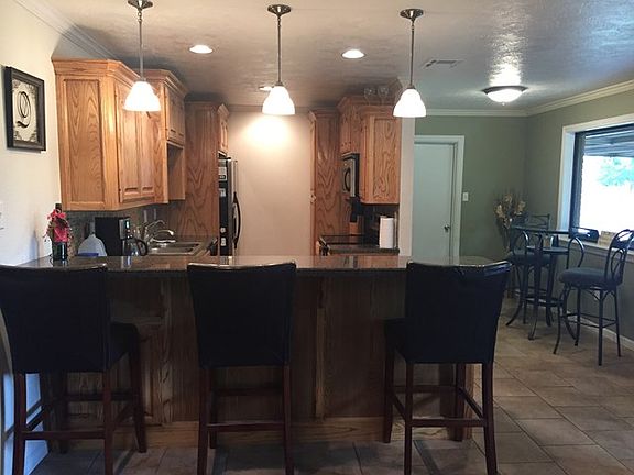 Mature trees, covered front and back patio! Nicely updated kitchen, & bathrooms! Open floor plan-kitchen, living room, dining over see two large windows to the backyard! Many updates throughout! Bdrms carpeted.Tiled bathrooms, living rms,kitchen. You can choose if you want 2 liv rms, or 2 dining! Large laundry room, big enough for a sm study! Shed & gutters! New gas water heater,and sewer line!