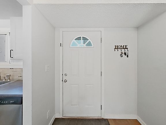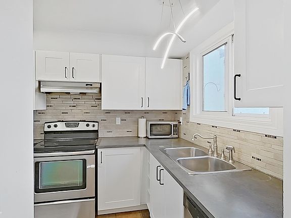 Hardwood floorsModern kitchenUpdated cabinetsSs appliancesTile backsplashCozy gas fireplaceDining area