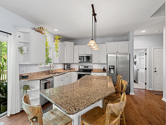 Welcome to this stunning home in the desirable Pagemore community of Durham, NC! As you enter, you'll be greeted by beautiful hardwood floors that lead you to the spacious open floor plan. The large, updated kitchen has white cabinets, granite countertops, updated stainless steel appliances, and a center island, making it ideal for entertaining your neighborhood guests. The first-floor owner's suite features a walk-in closet, private en-suite bath with dual sinks, a separate shower, and a large tub. Upstairs, you'll find two bedrooms, a bathroom, and a huge bonus room that has been set up as a retreat by day but transforms into a social speakeasy vibe at night, where everyone loves to come and visit. This versatile space also has a separate closet and offers endless possibilities for your lifestyle needs. Outside, you'll find an oversized deck, perfect for summer nights, overlooking a private yard with tranquil wooded views. Conveniently located near RTP, RDU, and Brier Creek, this home offers easy access to everything the area has to offer. Don't miss your opportunity to see this incredible home in Pagemore!