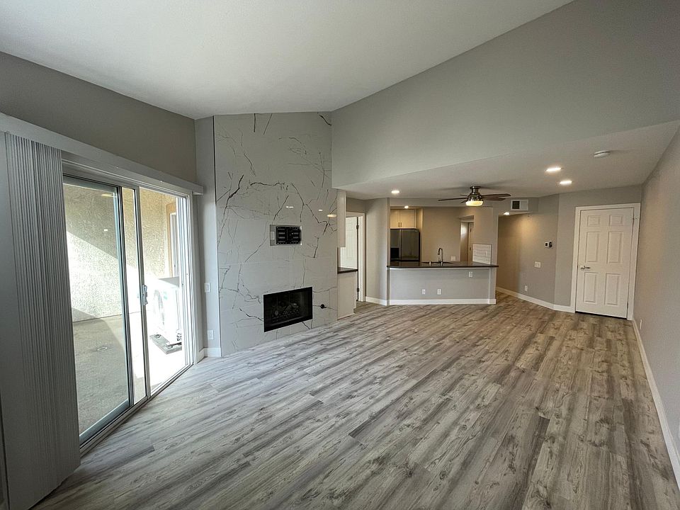 This is a beautiful and spacious 3 bedroom, 2 bathroom condo that has been fully renovated with modern and chic finishes. The condo features a large open living room with a stunning tall fireplace equipped with a TV mount and a private balcony that offers beautiful views of the Palos Verdes Peninsula. Recessed lighting throughout. The brand new kitchen comes equipped with quartz countertops, shaker cabinets, and stainless steel appliances, including a new dishwasher and refrigerator with an icemaker and water dispenser. The master bedroom is a luxurious space that boasts a walk-in closet, high ceilings, balcony access, and a dual-sink master bathroom with a new shaker front vanity and marble countertop. The two other bedrooms are full-sized and have their own closets. The second bathroom is a full bath with a tub. Stacked laundry is conveniently located in the unit. The condo has both central heat and air conditioning with a brand new efficient SEER 18 system. The building is quiet and provides a great work-from-home location with fiber optic internet up to 5 Gigs. The unit has two assigned parking spaces near the elevator, as well as plenty of street parking. Water and trash are included in the rent. The amenities in the building include a pool and a clubhouse, and the location is close to 7th, PCH, and 405. It is also near the East Traffic Circle, Wilson H.S., and walking distance to the Bamboo Club. The condo is a short drive to Belmont Shore and Downtown, making it a great location for those looking to explore Long Beach. Two Designated Parking Spaces with Secure Gate Access and tons of street parking. Pets ok w/ additional deposit. Trash and Water included. Renters Insurance required.