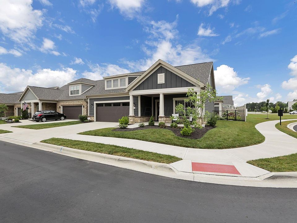 This pristine Epcon condo situated on a corner lot will ''wow'' you once you pull up, paired with custom features throughout, including custom silhouette blinds, hardwood floors & lighting. The spacious, open floor plan features a large den/bedroom with double sliding doors, ideal as a flexible space. Enjoy the cozy fireplace in the great room. Spacious kitchen with quartz counter, stainless steel appliances, gas cooktop, and large island with bar area, perfect for entertaining. Laundry room with tub & storage. Sizeable ''Mud Room'' as you enter through the garage! The primary suite features a tray ceiling, custom fan, and a large door leading to a beautiful outdoor enclosed area. Enjoy the luxury of a huge walk-in closet, designer shower, upgraded light fixtures, appliances, and a private fenced patio ideal for entertaining. Tankless Hot Water Tank. Located near the clubhouse with a pool, gym, and pickleball court. Close to downtown Grove City & more.