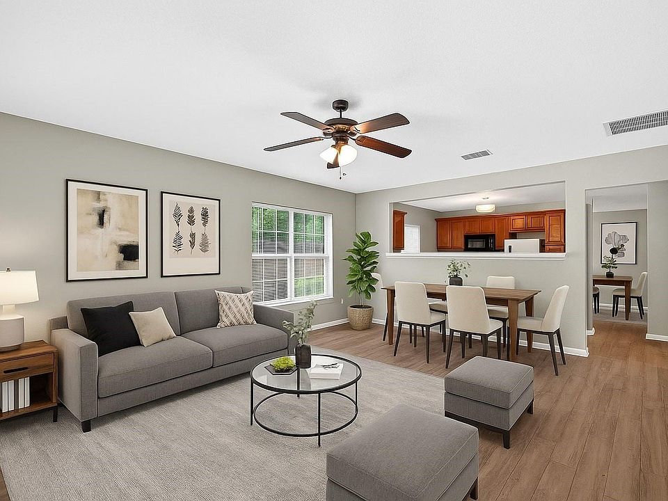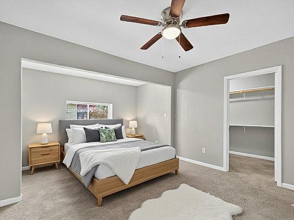 Modern ceiling fanPlush carpetingStainless appliancesPlenty of storageWood-style flooringPrivate en suite bathWood cabinetry
