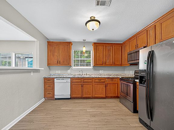 Beautifully updated 3-bedroom, 2-bath home with 1,254 sq. ft. of inviting living space. The open-concept living room features wood-style flooring and a modern ceiling fan, while the kitchen boasts wood cabinetry, stainless appliances, and a pass-through window. Each bedroom offers plush carpeting and ample closets, with the primary suite highlighted by an oversized walk-in closet and private en suite bath. Recent upgrades include a 1-year-old roof and brand-new water heater. A dedicated laundry area and plenty of storage add convenience. Outside, enjoy a welcoming front porch, private driveway, and fenced backyard—perfect for relaxing or entertaining. Move-in ready with updates you’ll love!