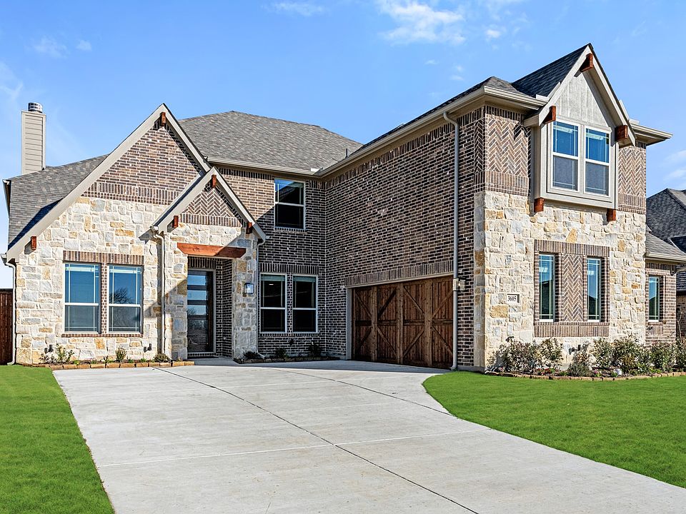 NEW! NEVER LIVED IN. Gorgeous open-concept living space with 6 bedrooms and 5 baths in this versatile, two-story Bloomfield home with a J-swing driveway! Made for entertaining friends & family, the Deluxe Kitchen includes custom cabinetry with built-in SS appliances, a walk-in pantry, Quartz countertops, and a large center island overlooking the Family Room. A soaring Stone-to-ceiling fireplace was added to the Family Room, and the adjacent Breakfast Nook has a window seat & access to the Covered Patio for indoor-outdoor living. Wood floors throughout and upgraded tile in the baths! Study with Glass French doors off the entry. Spacious Game Room, Media Room with surround sound, and 3 more bedrooms with walk-in closets upstairs. Blinds & gutters added! Impressive stone & brick elevation enhanced by a custom 8' front door, cedar garage door, and full landscaping with stone edging. Call Bloomfield at The Grove today to learn more about your dream home!