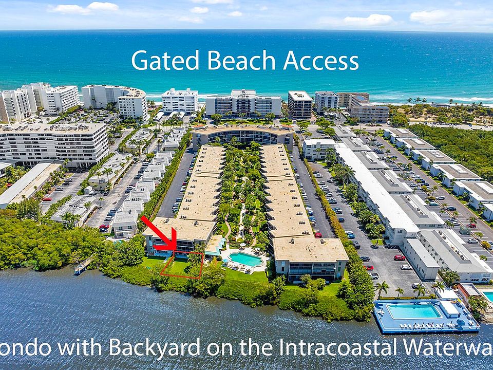 RENOVATED 2 bedroom WATERFRONT condo with PRIVATE backyard ''limited common area'' on the Intracoastal. Walk across the street to the OCEAN with PRIVATE gated BEACH access! Bright new kitchen with open concept dining & living room, with upgraded Impact hurricane windows & slider that is great for entertaining. This 2-bed (previously 3 bedroom), 2.5-bath home with large master bedroom & ensuite bathroom, walk-in closet & private laundry room. 2nd bedroom also has a full bathroom & walk-in closet.Located only steps to the heated waterfront pool and assigned parking near the unit at the end of covered walkway. BBQ area, doorman, on-site manager and the private beach access across the street. Only 20 minutes to to the Palm Beach airport, close to shops & the Old Key Lime House