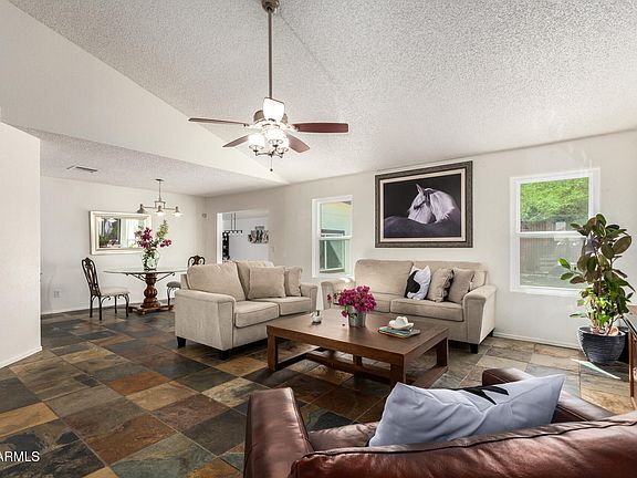 Prepare to fall in love with this delightful 3-bedroom home featuring a 2-car garage and low-care front yard! Discover a large living & dining room filled with natural light, offering tile flooring, vaulted ceilings, and neutral paint throughout. Sizable family room has sliding glass doors that open to the back patio, creating a seamless indoor-outdoor flow. Lovely kitchen displays recessed lighting, plenty of cabinets, a pantry, stainless steel appliances, and a breakfast bar. Impeccable primary bedroom includes a private bathroom with dual sinks, a make-up desk, and well-sized closets. With its built-in bench, fire pit, and storage shed, the generous sized backyard is the perfect spot for unwinding or hosting lively gatherings. This incredible gem won't last long!