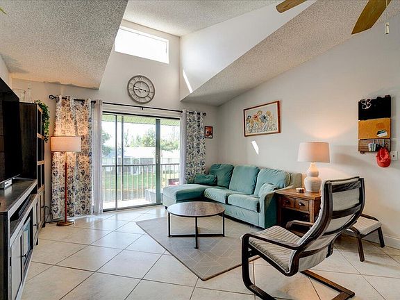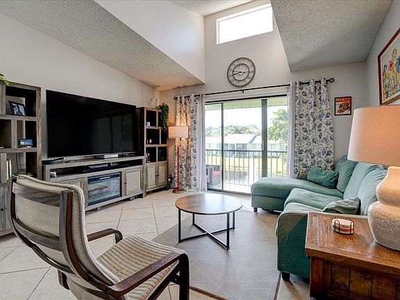 Lovely 2 bed/2 bath condo, located on the 3rd floor with vaulted ceiling, lots of natural bright lighting, tile throughout, and stunning views of the serene lake with fountain in an all age community. AC 2023, Kitchen Appliances 2022, Water Heater 2019, roof 2023. This gated community has a fenced in pool, clubhouse, tennis/pickle ball court, and tons of guest parking. (1) assigned parking space and guest spaces available. No Lease first 2 years. Great central location close to I95, turnpike, outlet mall, downtown, and the beach. Monthly HOA fee includes basic cable, internet, and water.