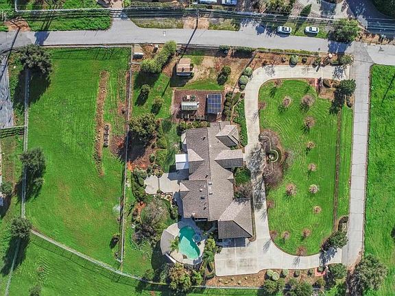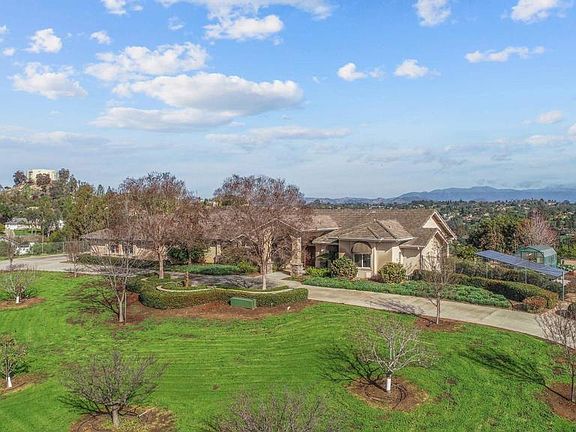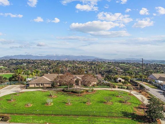 This spectacular single-story 4+ bedroom and 3 bath Harmony Hill masterpiece features all of the luxury and accoutrements you could ask for and more. As you drive up the hill to the large 2.74 acre property, you are greeted by a beautiful electronic gate and fence that completely surrounds the property, opening to a U-shaped driveway that drops you off at the front door. Around the corner is a spacious 3-car garage with epoxied floors, bringing you into the home. The entire perimeter of the home is covered by dusk-to-dawn floodlights and cameras, and the foliage and grounds are well looked after. The owners have meticulously upgraded and maintained every aspect of the home, from installing gutter covers around the home, redoing the entire irrigation system, replacing a worn backyard patio covering with a strong and resistant alumi-wood awning, installing a privacy screen around the pool, installing a fully-owned solar system, and more. Walking into the home you are welcomed by spectacular views out the large windows and doors, with large welcoming rooms with high ceilings. To the right is the spacious master bedroom with an en-suite office and large en-suite master bathroom, featuring a large bath with jets, double headed shower, and two walk-in closets. Connecting to the rear patio, there is space and a hook-up for a future spa if desired. To the left of the foyer is the dining room and a hallway to the three bedrooms, kitchen, and family room. The dining room features easy access to the kitchen, a beautiful inset ceiling design, and shelving. The top of the line kitchen features a large usable island and space for a breakfast nook. An amazing Viking range with large hood and recently rebuilt Kitchen-Aid fridge with matching cabinet-ware gives the kitchen a distinctive look. Adjoining the kitchen is a large and welcoming family room complete with a wood-burning insert fireplace with a fan, giving the space nearly instant heat and the charm of a good fire. Dual HVAC units in the home complete the picture for the ultimate in zoned climate control and comfort. The second of the bathrooms sits between two separate bedrooms in the hallway. The last bedroom is large and accessible from outside, making it a perfect guest-suite. It also comes with a beautiful built-in Murphy bed with a high quality mattress. The laundry room is spacious and features a sitting space for a sewing machine or other workspace. Outside, you will find a bird sanctuary with plenty of space for outdoor meals, panoramic views of Fallbrook and the surrounding area, and ample space for any projects you may have. A pool and spa, greenhouse, and shed for tools or storage are also available. In the back yard there are several large and mature avocado and fruit trees that produce fantastic fruit. This home has everything you need, including easy access to shopping, the highways, as well as the seclusion you will come to expect from Fallbrook. Come and check out this dream home soon before its gone! *All information deemed accurate but buyers and their agents should independently verify all information themselves.