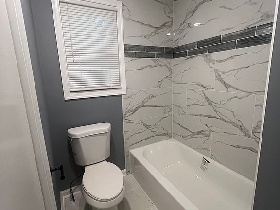 Beautifully remodeled bathroom with tile surround and tile flooring. Assess to the washer dryer is through the bathroom.