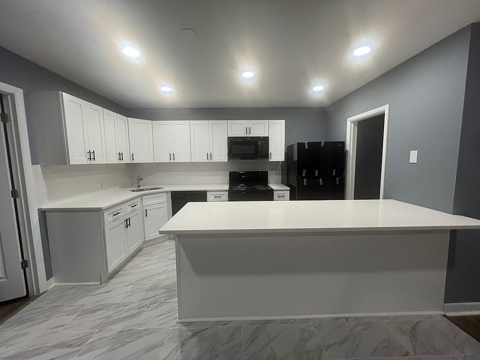 The spacious kitchen has beautiful white cabinetry, granite counter top, tile backsplash and tile flooring with an island.