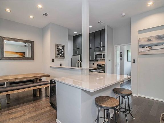 Central to everything Dallas has to offer: Contemporary, updated condo in the highly desired Mansion Park community NOW AVAILABLE! Friendly six unit building nestled within beautifully established trees offers a covered parking space from the rear entry and is just a short walk to the Katy Trail. The owner has added hardwood floors wood blinds, Blanco sink w new faucet, Quartzite counters & tile backsplash in kitchen, new paint and more! Floor to ceiling windows line the common area offering tons of natural light. This trendy 2-story condo has one large bedroom, custom closets & a large luxurious bathroom with a walk-in shower. A great place to call home! Call to schedule your showing today and fall in love!