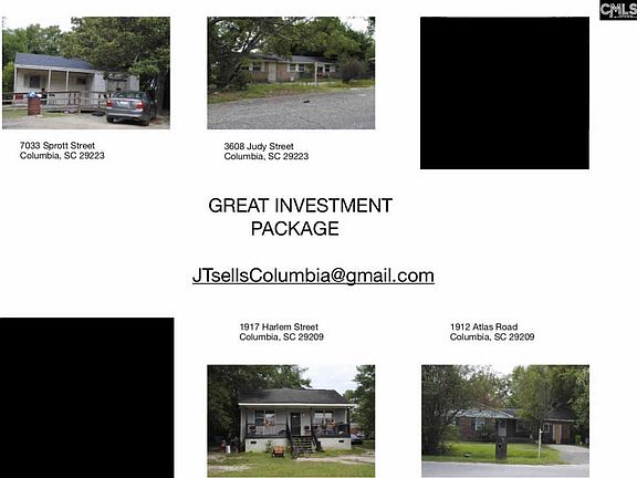 Great investment package. ** All renters are month to month. 7033 Sprott St Rented $600.00 rent 1912 Atlas Rd Rented $600.00 rent 1917 Harlem Rented $750.00 rent (are on 1 TMS map number under 1912 Atlas, both homes on 1 lot) 3608 Judy St Not rented Each home is $42,000.00 EACH!!