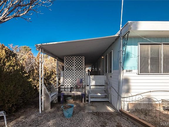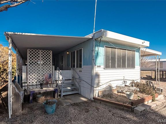 Cute singlewide on a fenced lot. In 2013 this home was Rehabbed and gone through by Mohave County Housing Rehabilitation.FULL LIST AVAILABLE OF PERMITED REPAIRS DONE Which included, new heat pump, roof overlay with elastameric, all new dual pane windows, reinforced deck and paint,new shower with grab bars, new exterior doors, re plumb washing machine to code and much more, seller can provide list of all repairs done by the County. Large covered deck and covered carport. Open kitchen with lots of cabinets, fridge stays and living room with lots of windows. Bedroom has builtin storage with drawers and shelving along with nice sized closet and lots of windows and ceiling fan. Fenced lot with 2 nice sheds, garden area and mature trees.