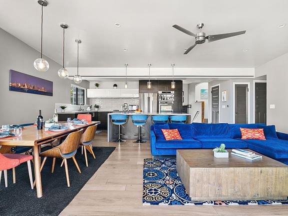 Step into a bright, open living space where a gourmet kitchen with a sprawling quartz island flows seamlessly into a relaxed dining and living area perfect for unwinding or hosting. Large sliding glass doors frame the impressive vistas and open to an expansive balcony, inviting you to lounge and soak in San Diego's iconic outdoor lifestyle. Hardwood floors and dimmable LED lighting set a sophisticated tone throughout.