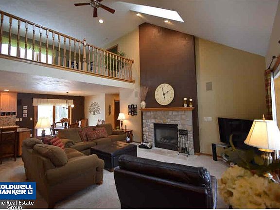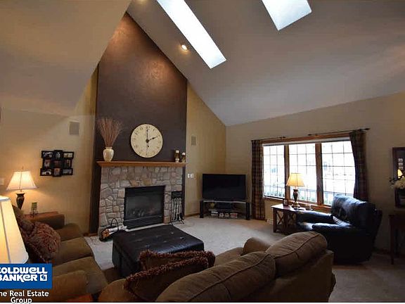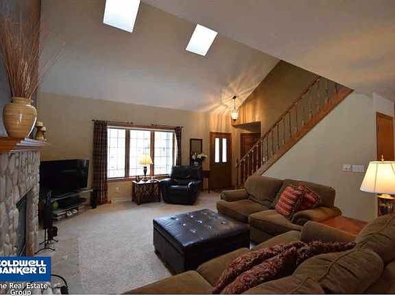 Gorgeous Custom built open concept home on beautifully landscaped lot. The great room features soaring ceilings with skylights and stone fireplace. Quartz countertops and stone backsplash in kitchen, Dura-Ceramic floors & newly added stainless stove, microwave and Bosch dishwasher. 1st floor master bedroom has updated carpet, 2 closets and the bath has updated granite counter, fixtures and tile floor. Upstairs find 3 large bedrooms complete with extra shelving in the closets, full bath with skylight and a wonderful, large loft area. Additional features include surround sound, first floor laundry and beautifully finished lower level with liquid granite floors, full bath & exercise room. Brick paver patio overlooks tree lined backyard. Garage is tandem on one side and 35 ft deep, additionally there is a drop down ladder with room for more storage above.
