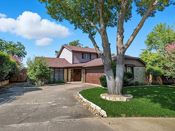 Nestled on the Bedford Colleyville border, this 4-bedroom, 2.5-bathroom home combines rustic character with modern comfort in the heart of a private cul-de-sac. Designed for both everyday living and effortless entertaining, the property boasts an expansive covered patio, elevated deck, refreshing above-ground pool, and a lush yard that feels like your own private escape. Inside, the warm and inviting floor plan highlights a spacious kitchen with handsome cabinetry, granite counters, a center island, and an impressive under-stair storage pantry. Natural woodwork, wood-look tile flooring, stacked stone fireplace, and neutral tones carry a charming rustic elegance throughout.The downstairs primary suite is privately tucked at the back of the home and features a fully updated bathroom with a huge walk-in shower and oversized closet. Upstairs, three generously sized bedrooms and a large bath with dual vanities offer comfort and convenience. Notable upgrades include a new roof in 2024 and garage door January 2025. Set in a highly desirable location served by acclaimed HEB schools, this home is less than 15 minutes from Southlake Town Square’s premier shopping and dining—offering the perfect balance of tranquility and accessibility.