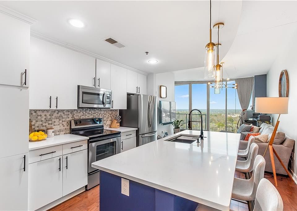 LIVE-WORK-PLAY at Twelve Midtown Residences (formerly Twelve Atlantic Station), a condotel that's part of the Marriott Autograph Collection! Enjoy the breathtaking Buckhead views from this totally chic, light-filled, 16th floor loft. Recently renovated with high-end designer finishes that include white painted cabinets with oversized onyx cabinet pulls, navy island, leveled white quartz countertops, modern tile backsplash, and stainless steel appliances. This gorgeous kitchen flows seamlessly into the large open living room that includes floor to ceiling windows and thousands of dollars’ worth of custom draperies and custom lighting throughout to remain. You can step out onto your sizable and romantic private balcony and enjoy that glass of wine while watching the amber sun sink beneath the horizon in the evenings. Twelve Midtown features 24/7 concierge along with gated secure parking, a huge pool with multiple cabanas, fitness center, and renovated club room. Just steps from your door you will find Target, Publix, LA Fitness, Movie Theater, a variety of delicious restaurants & shops. Another perk, the Atlantic Station shuttle takes you directly to the Arts Center MARTA and GA Tech.