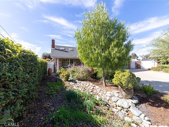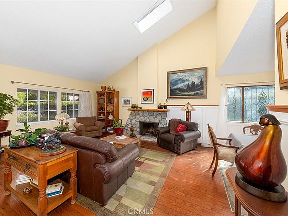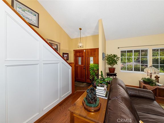 This 5 bedroom 3.5 bath pool home in Calimesa is a beauty! Located at the end of a cul-de-sac with a great view of lush trees, valley and hills below. Home features 3 car garage, separate living room & family rooms with a downstairs bedroom and balcony off the primary suite. Located on over 1/2 acre this property features a lower orchard with 3 dozen citrus trees including lemons, limes and oranges with a walnut tree also. Leased solar with 16 panels and battery backup. Enjoy the warm summer days with a deep heated inground pool with spa and slide, pool heater replaced summer 2023. Home has many upgrades & designer features throughout including wood flooring and wainscoting in the front rooms with fireplace and skylights in the living room and leaded glass in the dining room. Wood covered ceiling and tile floors in the family room with French doors leading the rear covered patio. Remodeled kitchen with stainless steel sink, glass cabinet doors, tile floors, custom ceiling & tile backsplash. Spacious bedrooms with jack & jill bathroom between 2 of them. Primary suite with remodeled bathroom with walk-in shower and door to covered balcony with beautiful views. Home also features dual pane windows, a central vacuum system, plenty of storage cabinets and wood stairs. Low property taxes and no HOA dues. Home has been well maintained, come and see!