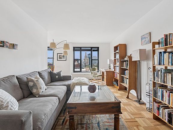 The apartment’s thoughtful flow includes an airy, sun-drenched living space with a generously sized dining area that seamlessly connects to the windowed kitchen, featuring a separate breakfast nook with additional storage. The two spacious bedrooms are set at the back of the apartment and are bathed in sunlight. Every window frames a breathtaking view—from the Freedom Tower and Manhattan Bridge to the Manhattan and Downtown Brooklyn skylines. The unobstructed vistas and natural light make the entire home feel open and peaceful, with room to grow thanks to its exceptional layout.