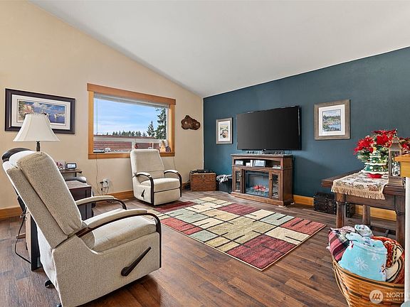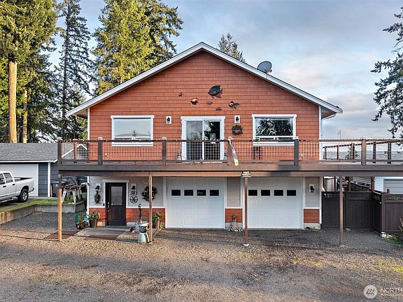 Treasure Island Home with views of Mt. Rainier, Olympic Mountains, Stretch Island, Fair Harbor Marina & Puget Sound. The upper floor is the heart of the home featuring an open concept floor plan w/ vaulted ceiling throughout the freshly finished kitchen w/ island & spacious living room. Relax on the wrap around deck sunrise to sunset. Primary bedroom, guest bedroom, full bathroom & utility room. Main floor features the Oversized Garage, workspace, 3/4 bath & storage room that could easily be converted into a main floor apartment. Private backyard, hot tub and guest cabin. Tons of Parking and RV space with Hook-Ups too! This coveted private island features a wonderful community beach and moorage dock for residents. Welcome Home!!