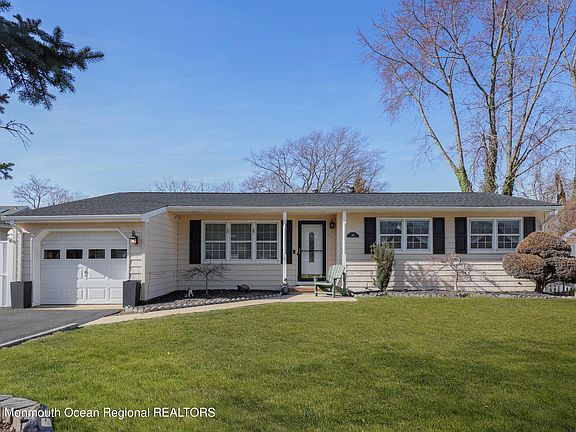 Inside displays true hardwood and vinyl flooring with modern tones across various spaces of leisure and function, including a large living room opening to the formal dining room positioned beside an open kitchen with ample cabinetry and nearby backyard access. The bedroom capacity offers tremendous versatility for a variety of living or work arrangements, suitable for the growing family or work-from-home functions. Hallmarking the interior is a vaulted family room with skylights (2021) and sliding-door access to the backyard, which is fully fenced-in and offers a gorgeous stone patio perfect for outdoor hosting, leisure and more, with sizable shed also granting extra storage capacity. An exceptional, move-in-ready opportunity in a fantastic family neighborhood at the Jersey Shore with easy access to the Garden State Parkway and Interstate 195. Conveniently located near shopping, restaurants, and beaches.