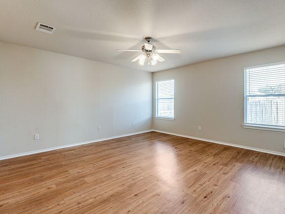 NO Carpet! Beautiful 4 bedroom, 2 bath home with open-floor and lots of natural light. Enjoy the large family room with dining attached. Spacious eat in kitchen with a breakfast bar that overlooks the family room. Owners suite with full bath is at the back of the house for quiet and privacy. Separate hallway to access laundry and 3 other bedrooms. House features walkin closets in most bedrooms. Ceiling fans now in all bedrooms! All windows have blinds. Backyard has a covered area perfect for outdoor dining or just relaxing. Fenced in yard. No fridge. Enjoy a shaded park with a playscape and swings just a block away! High desired neighborhood with great schools and easy access to IH-35, shopping centers and restaurants.