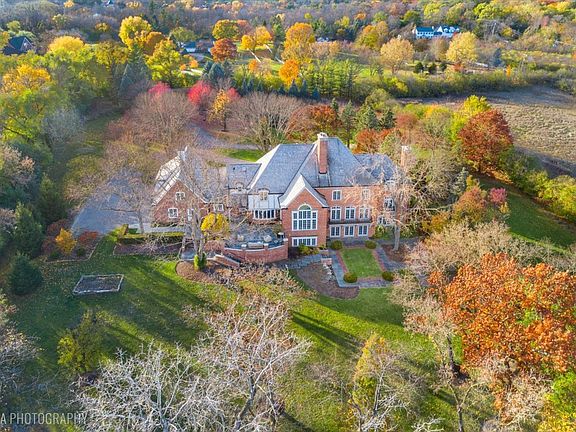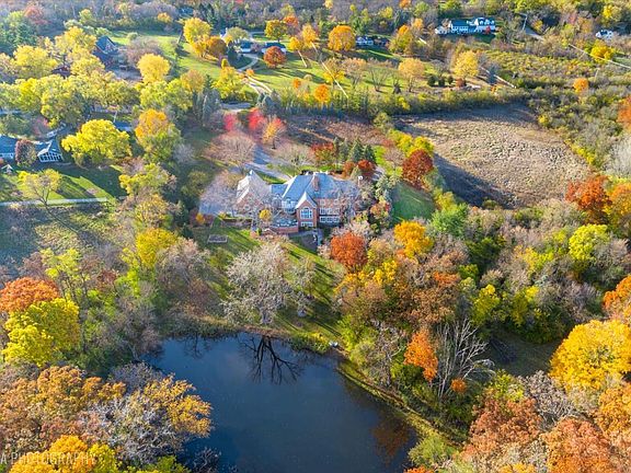 Luxurious, sophisticated, and timeless, this magnificent Barrington Hills estate is perfectly sited on a premier 5-acre waterfront setting-offering sweeping views, extraordinary privacy, and exceptional craftsmanship throughout. Custom millwork, arched passageways, gleaming hardwood floors, and five fireplaces create an atmosphere of warmth and refinement, while the home's flowing, light-filled layout invites effortless indoor/outdoor living. A grand two-story foyer with a curved staircase sets an elegant tone, revealing beautiful sightlines to the rear grounds. Formal living and dining rooms are complemented by a well-appointed butler's pantry with wet bar-ideal for hosting with ease. The striking great room impresses with soaring beamed cathedral ceilings, a dramatic brick fireplace, and an inviting, rustic-chic ambiance perfect for intimate gatherings. The newly renovated chef's kitchen is a true showpiece with custom inset cabinetry, quartzite counters, an oversized island with breakfast bar, high-end Thermador appliances, and a walk-in pantry. The adjoining breakfast room, wrapped in windows and featuring a charming bay window seat, frames picturesque views of the pond. Step directly outside to the bluestone patio and covered grilling station for seamless al fresco dining. A richly appointed main-floor library with cherry built-ins offers a quiet retreat or refined work-from-home space, conveniently located near a full bath. A spacious laundry room, mudroom with service entrance, rear staircase, and powder room complete the main level. Upstairs, the craftsmanship continues with a luxurious primary suite featuring a cozy fireplace, spa-like bath with whirlpool tub, glass door shower, and dual walk-in closets. Three generously sized secondary bedrooms-one ensuite and two sharing a Jack-and-Jill bath-along with a nursery or second office provide exceptional flexibility. A private guest wing enhances the home's versatility with its own living room, full kitchen, and ensuite bedroom, making it ideal for in-laws, long-term guests, or nanny. The expansive walkout lower level delivers even more living and entertaining space with a large recreation area, second kitchen, dining space, and direct access to the bluestone patio. A dedicated media/theater room, game or fitness room, wine cellar, half bath, and ensuite bedroom round out this impressive level. A heated 4-car garage with epoxy flooring, plus a large carport, accommodates guests and gatherings with ease. Multiple terraces, blue stone patios and pathways invite you to savor tranquil views of the pond and natural surroundings in every season. Meticulously maintained and thoughtfully updated, this remarkable estate offers a rare blend of beauty, privacy, and convenience-just minutes to town, train, riding trails, shopping, dining, and award-winning District 220 schools.