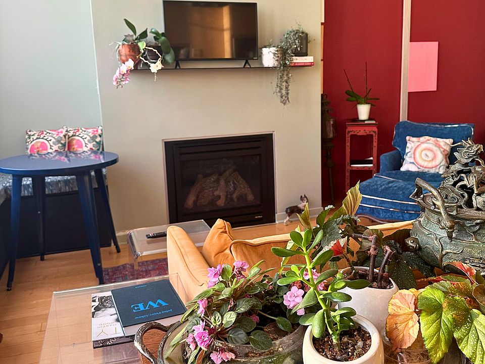 Every detail is designed for comfort: a gas fireplace, deep soaking tub, in-unit washer/dryer, and central AC + heat. The building offers secure entry, a well-equipped fitness center, outdoor grills, dining table, outdoor fireplace lounge, and assigned heated underground parking.